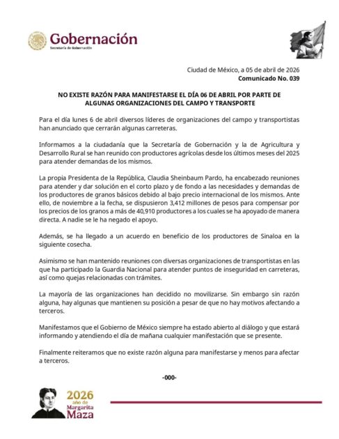 La Secretaría de Gobernación (SEGOB) emitió un comunicado oficial ante el anuncio de diversas organizaciones del campo y transportistas sobre posibles cierres viales programados para este lunes 6 de abril. La postura del Gobierno Federal es clara: se han atendido las demandas y no existen motivos para afectar a terceros.